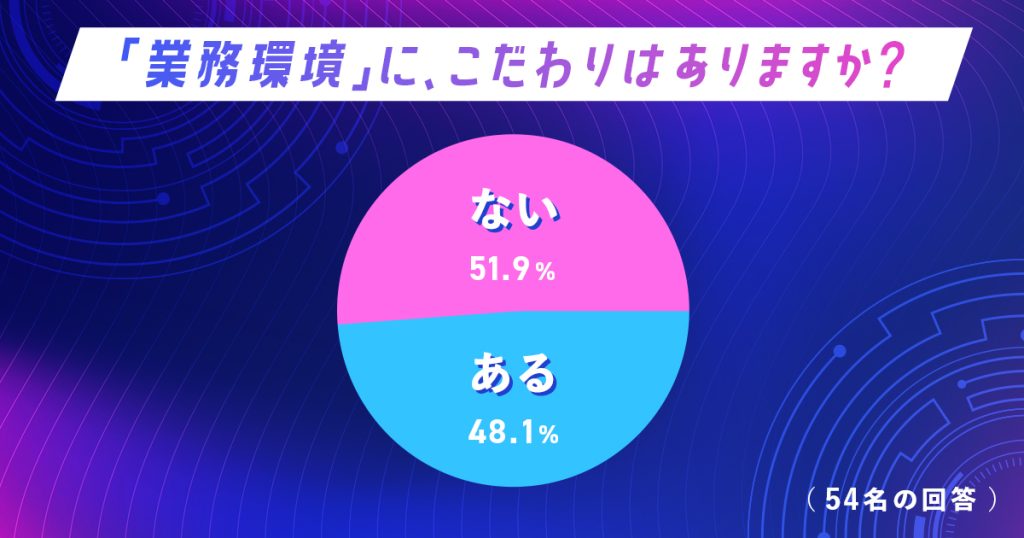 まず最初の質問では、「自分の業務環境にこだわりがありますか?」という質問をさせていただきました。結果は、「こだわりがある」と答えた方が約4割(26名)、「こだわりはない」が約6割(28名)と、大きく二分される形となりました。